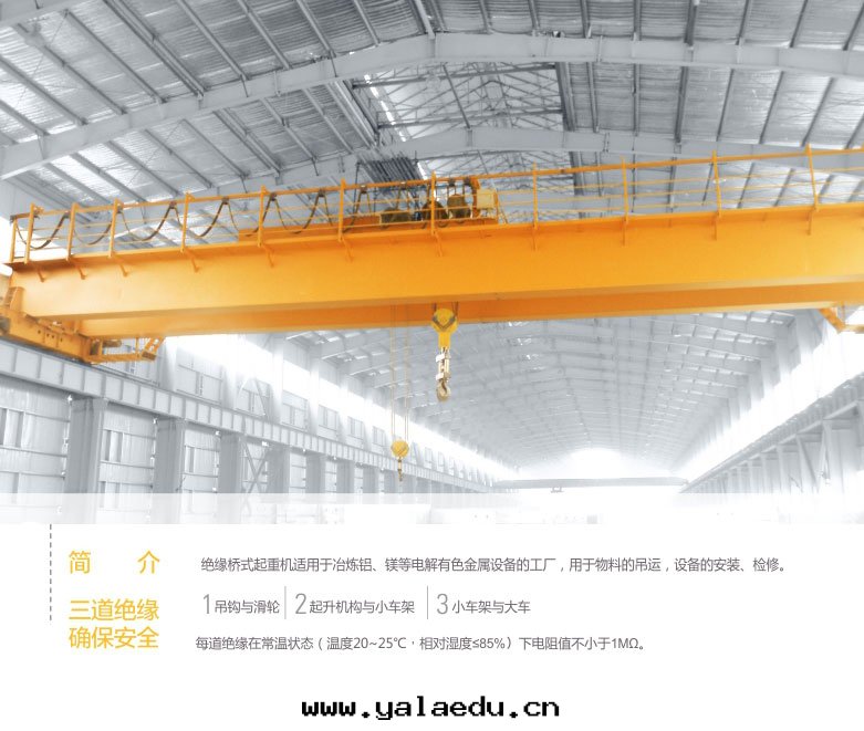 1、 QY型絕緣吊钩橋(qiáo)式起(qǐ)重(zhòng)機(jī)适用(yòng)于(yú)有(yǒu)色(sè)金(jīn)属電(diàn)解(jiě)鋁(lǚ)、鎂、铅(qiān)、鋅等冶煉車間(jiān)。